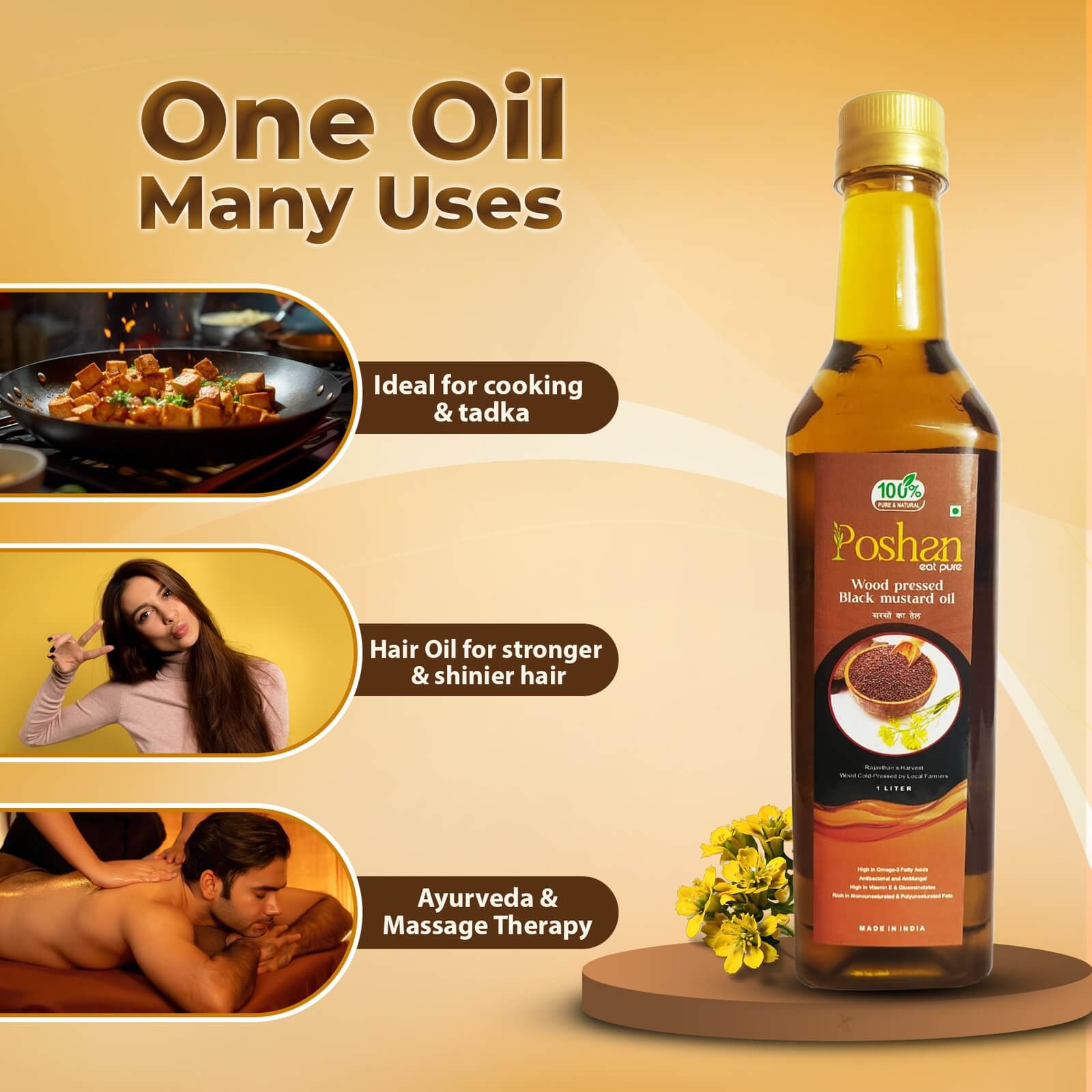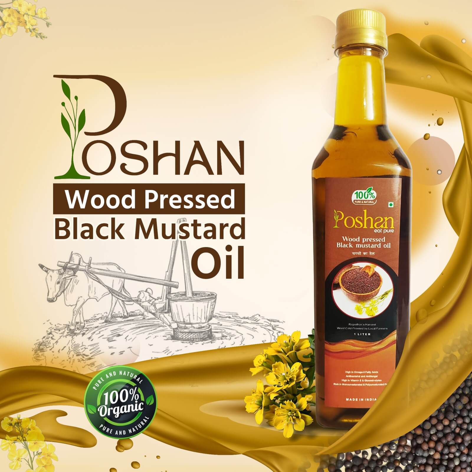 Made from carefully selected black mustard seeds, this oil is cold pressed at low temperatures